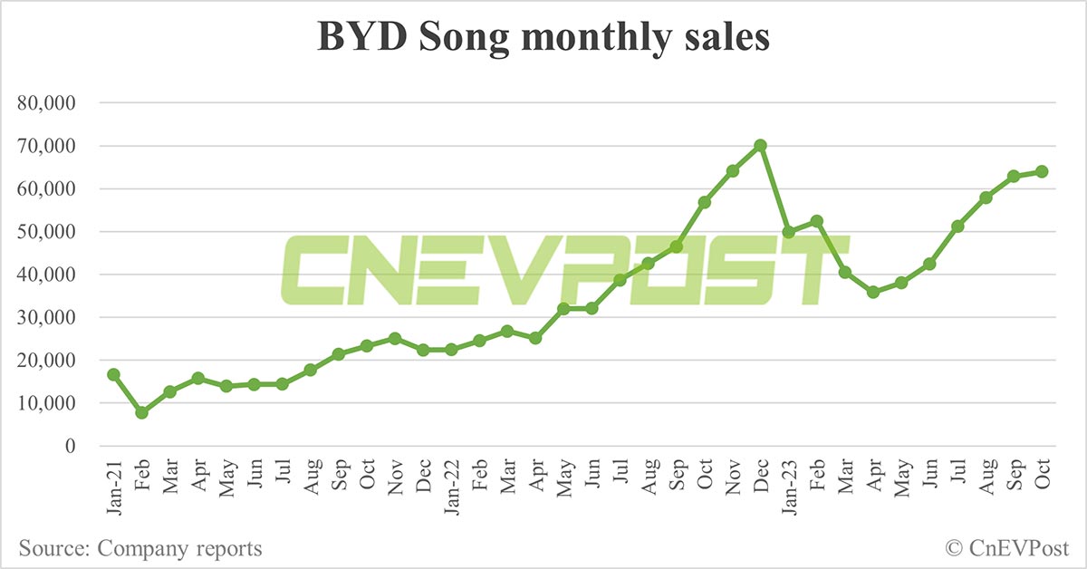 BYD’s Dynasty series of Song models sold 22,771 units in October, up 0.42 percent from 22,675 in September.