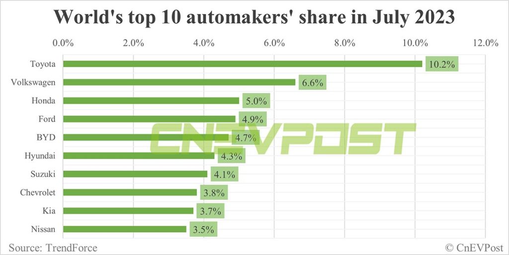 Honda and Ford were third and fourth, with global shares of 5.0 percent and 4.9 percent, respectively, in July.