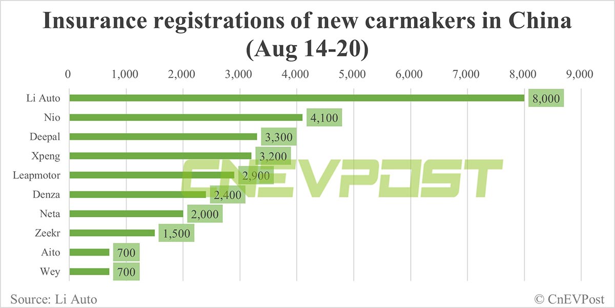 China EV insurance registrations for week ending Aug 20: Tesla 13,900, Li Auto 8,000, Nio 4,100