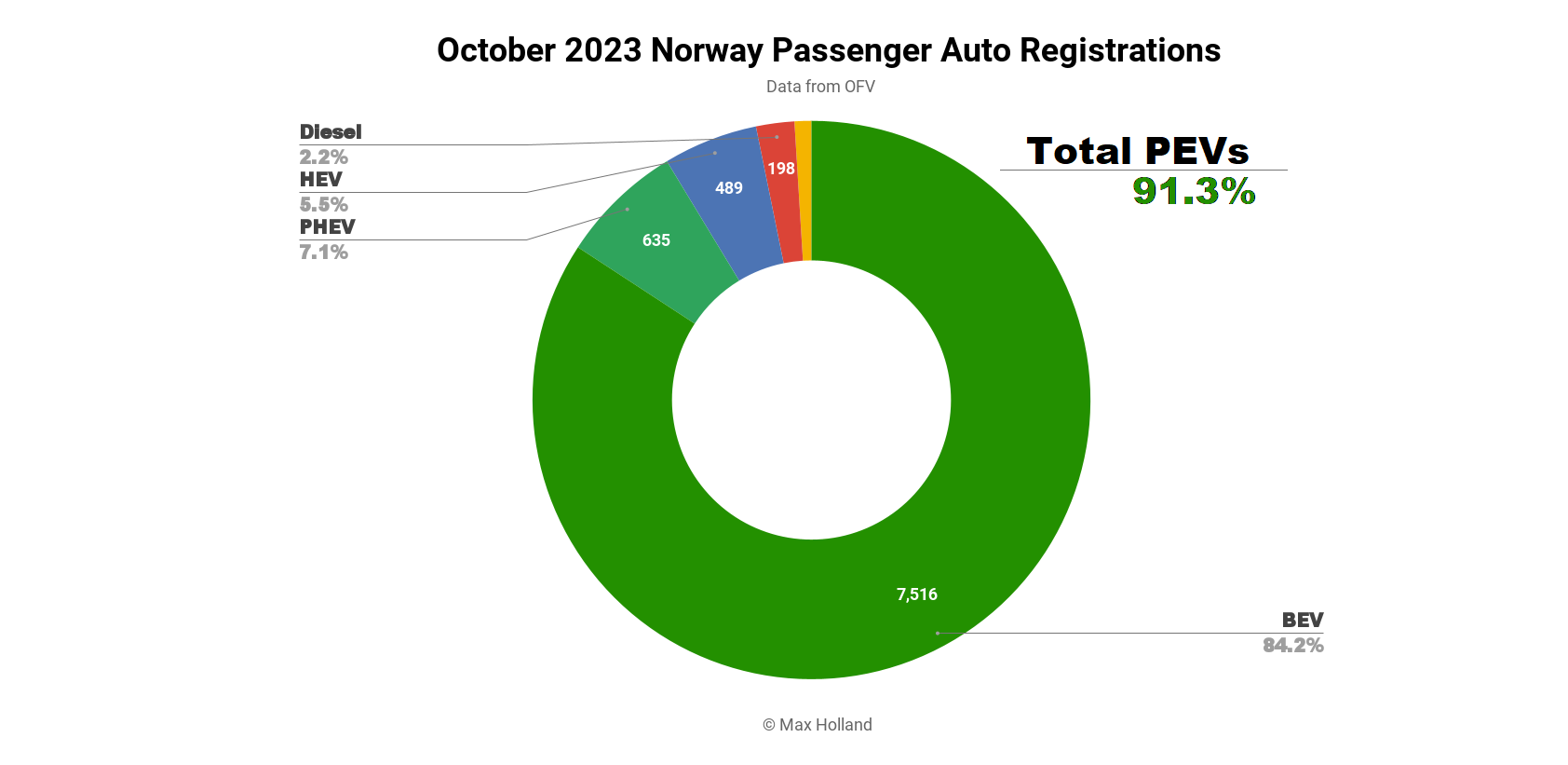 October saw combined EVs at 91.3% share in Norway, comprising 84.2% full electrics (BEVs), and 7.1% plugin hybrids (PHEVs). These compare with YoY figures of 86.4%, 77.5%, and 9.0%, respectively. BEVs have gained almost another 7% of the market over the past year, and PHEVs lost share, though not as rapidly as the other non-BEV powertrains.