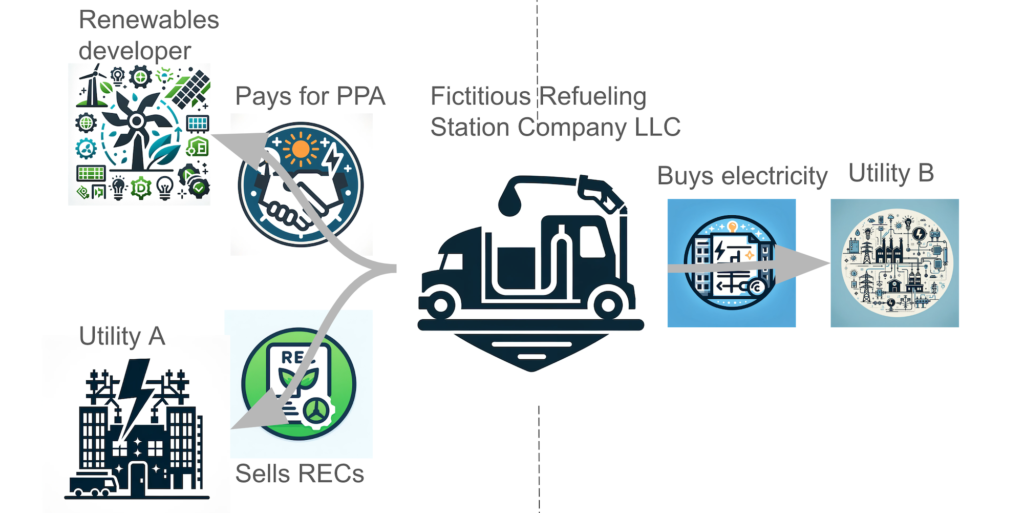 For a refueling station on a highway where trucks will refuel, the PPAs and RECs are completely irrelevant to the price of electricity delivered to the station. The only relevant factor is the local utility and their commercial rates. Buying electricity from the utility for batteries or hydrogen has no bearing on the price of electricity. The price of electricity at any hour or level of demand will be identical in both cases.