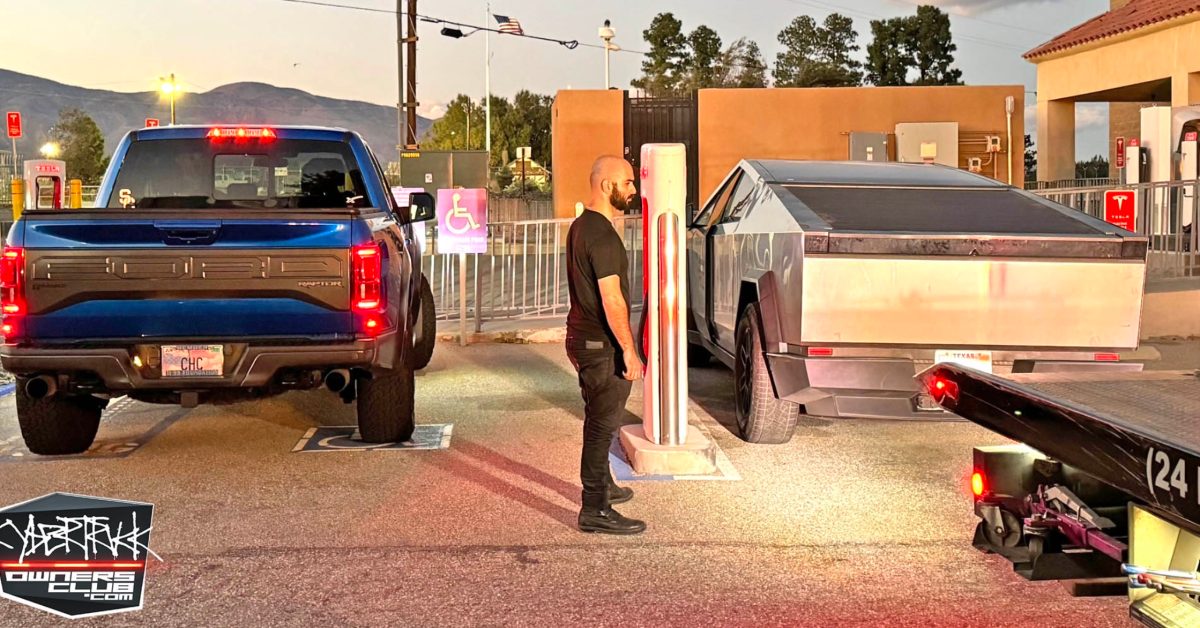 A Tesla Cybertruck couldn’t charge at a Supercharger station in the Mojave desert and had to be towed, but it gave us a half-decent size comparison with Ford F-150 Raptor.