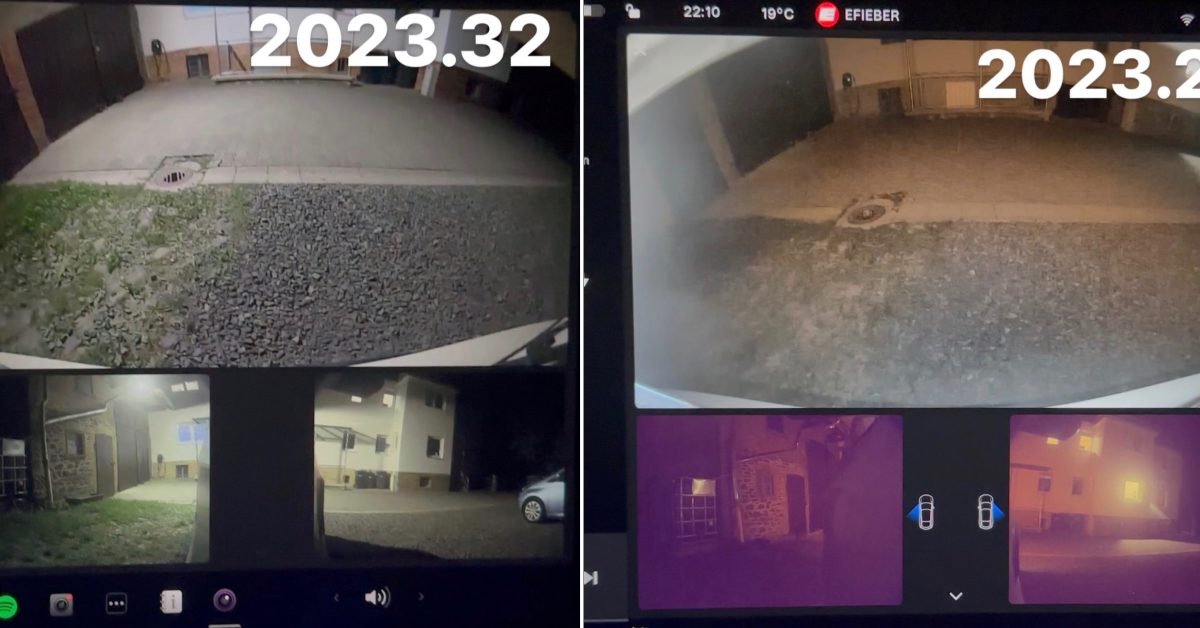 With the latest 2023.32 Tesla software update, the rendering quality of the cameras around your Tesla vehicles have greatly improved has highlighted by this side-by-side comparison: