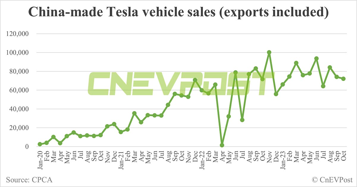 The US electric vehicle (EV) maker sold 72,115 China-made vehicles in October, up 0.57 percent from 71,704 in the same month last year, but down 2.64 percent from 74,073 in September, according to data released today by the China Passenger Car Association (CPCA).