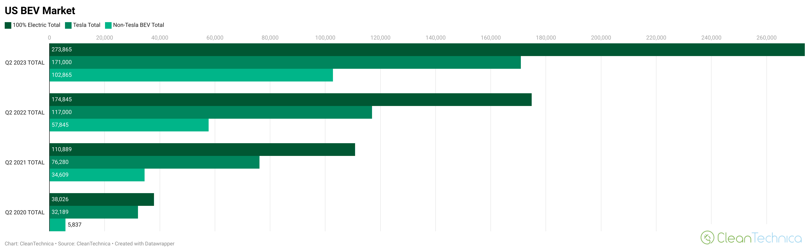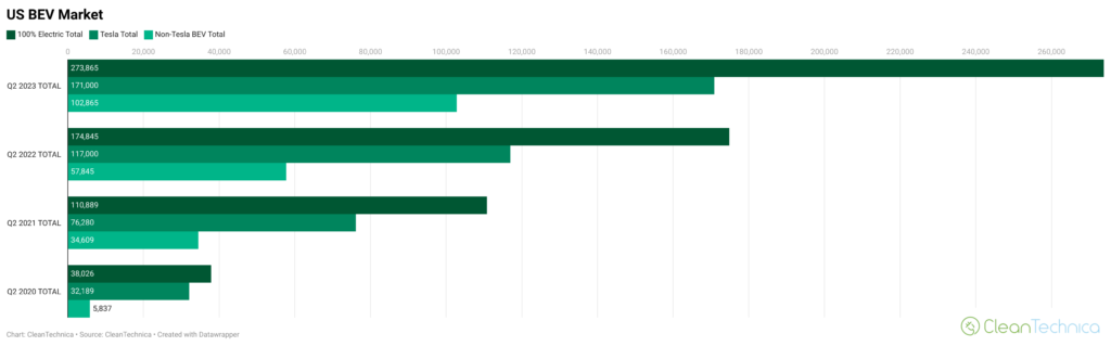 Overall (lacking just a little bit of data from automakers who are stingy with their stats), the US electric vehicle market grew 147% from Q2 2021 to Q2 2023. It grew 57% from Q2 2022 to Q2 2023.